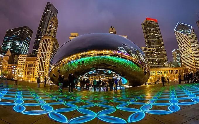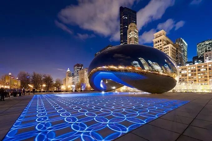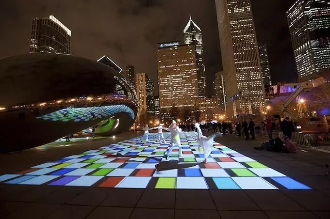 其实,类似的城市光影秀在芝加哥早已有过先河。2012年由本地艺术家LuftWerk创意团队利用光线、幻灯机,和锵铿有力的打击乐,精心布置了一场千禧公园”大豆子“声光秀,取名“Luminous Field ”(闪耀之地)。